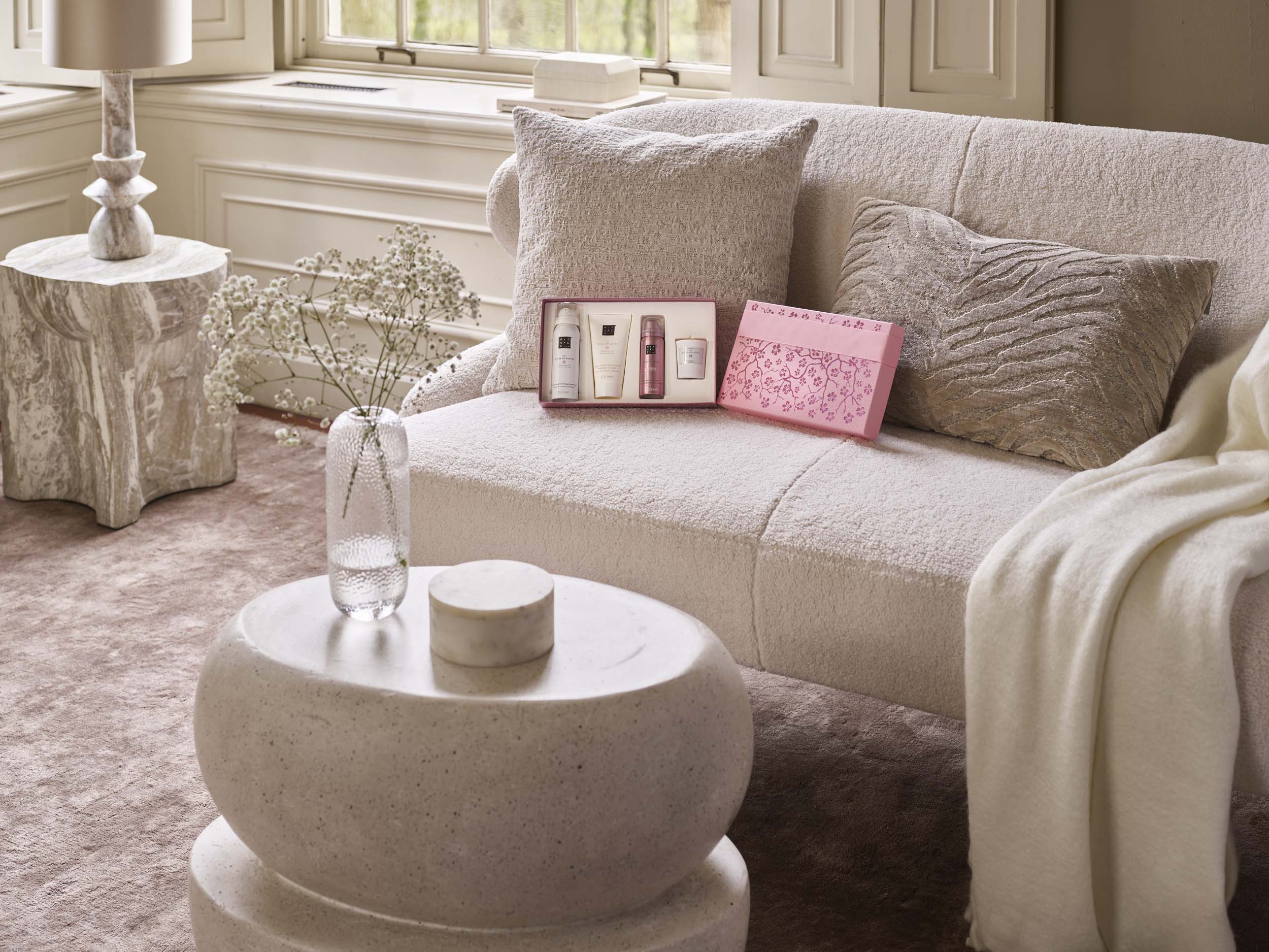Zawiera piankę pod prysznic w żelu, świecę zapachową, krem do ciała oraz peeling do ciała.produktami stworzonymi w oparciu o wyjątkowe aromaty kwiatów wiśni i mleka ryżowego.
