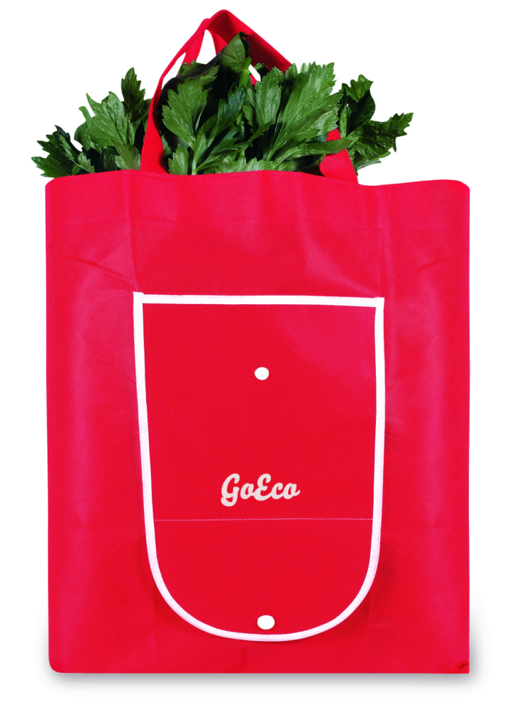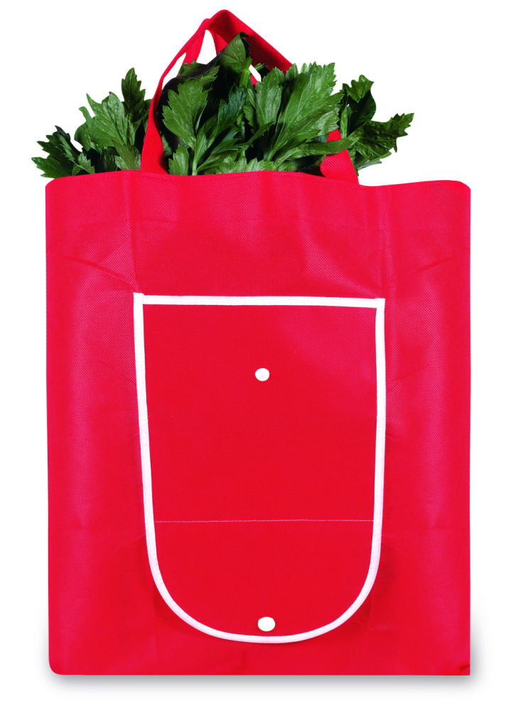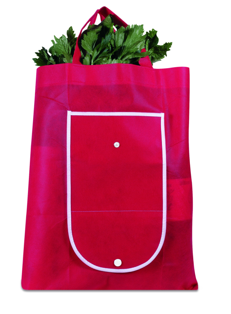 Składana torba na zakupy. Plastikowe zamknięcie z przodu. Materiał: fizelina (non woven) 70g/m². Produkt może losowo zostać dostarczony złożony lub rozłożony.