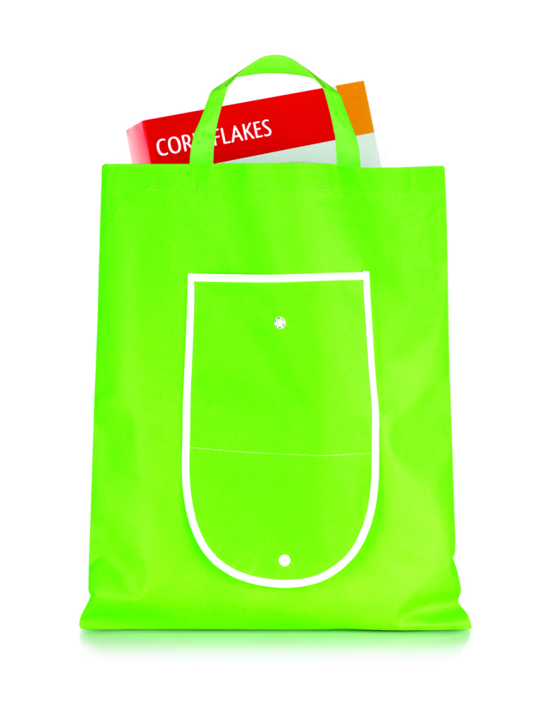 Składana torba na zakupy. Plastikowe zamknięcie z przodu. Materiał: fizelina (non woven) 70g/m². Produkt może losowo zostać dostarczony złożony lub rozłożony.