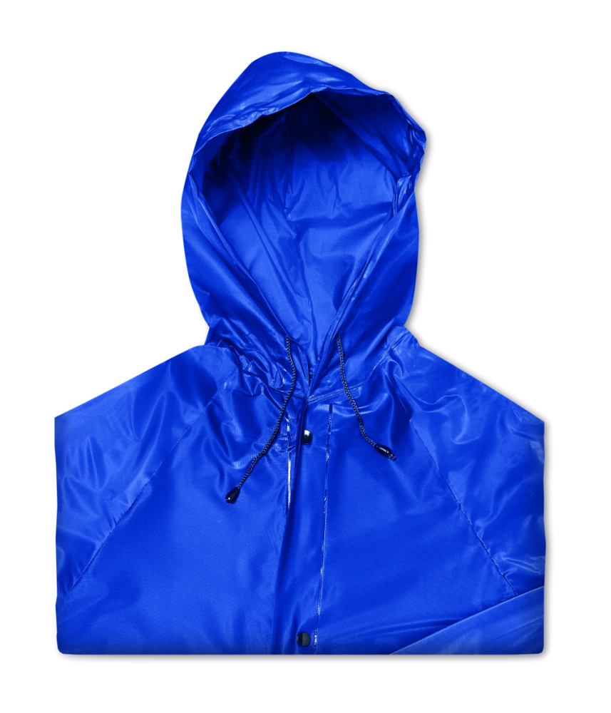 Płaszcz przeciwdeszczowy z materiału PEVA, z kapturem i kieszeniami z klapą, w nylonowym etui.