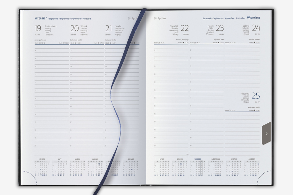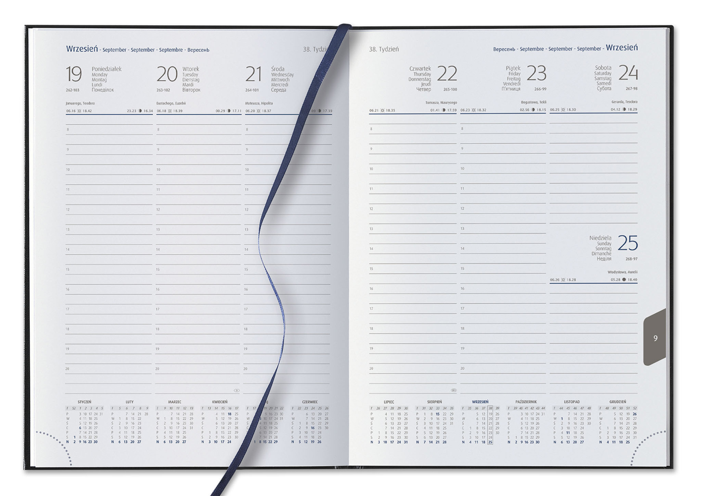 - Liczba stron: 144, kalendarium tygodniowe; 1 tydzień = 2 strony
