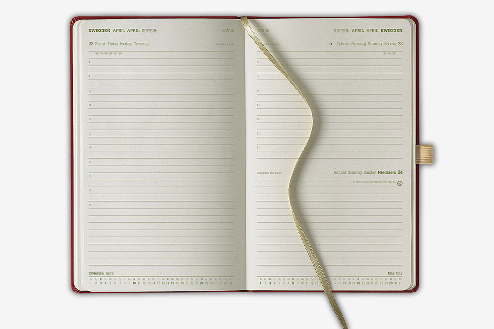 - Liczba stron: 352, kalendarium dzienne; 1 dzień = 1 strona, sobota i niedziela na jednej stronie