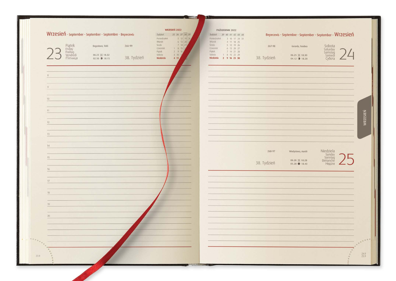 - Liczba stron: 352, kalendarium dzienne; 1 dzień = 1 strona, sobota i niedziela na jednej stronie