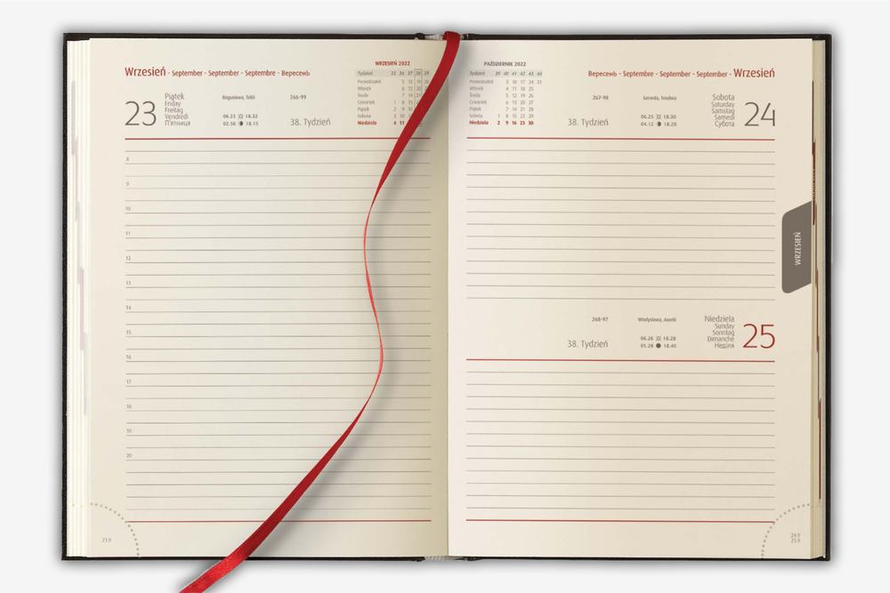- Liczba stron: 352, kalendarium dzienne; 1 dzień = 1 strona, sobota i niedziela na jednej stronie