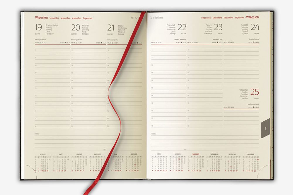 - Liczba stron: 144, kalendarium tygodniowe; 1 tydzień = 2 strony