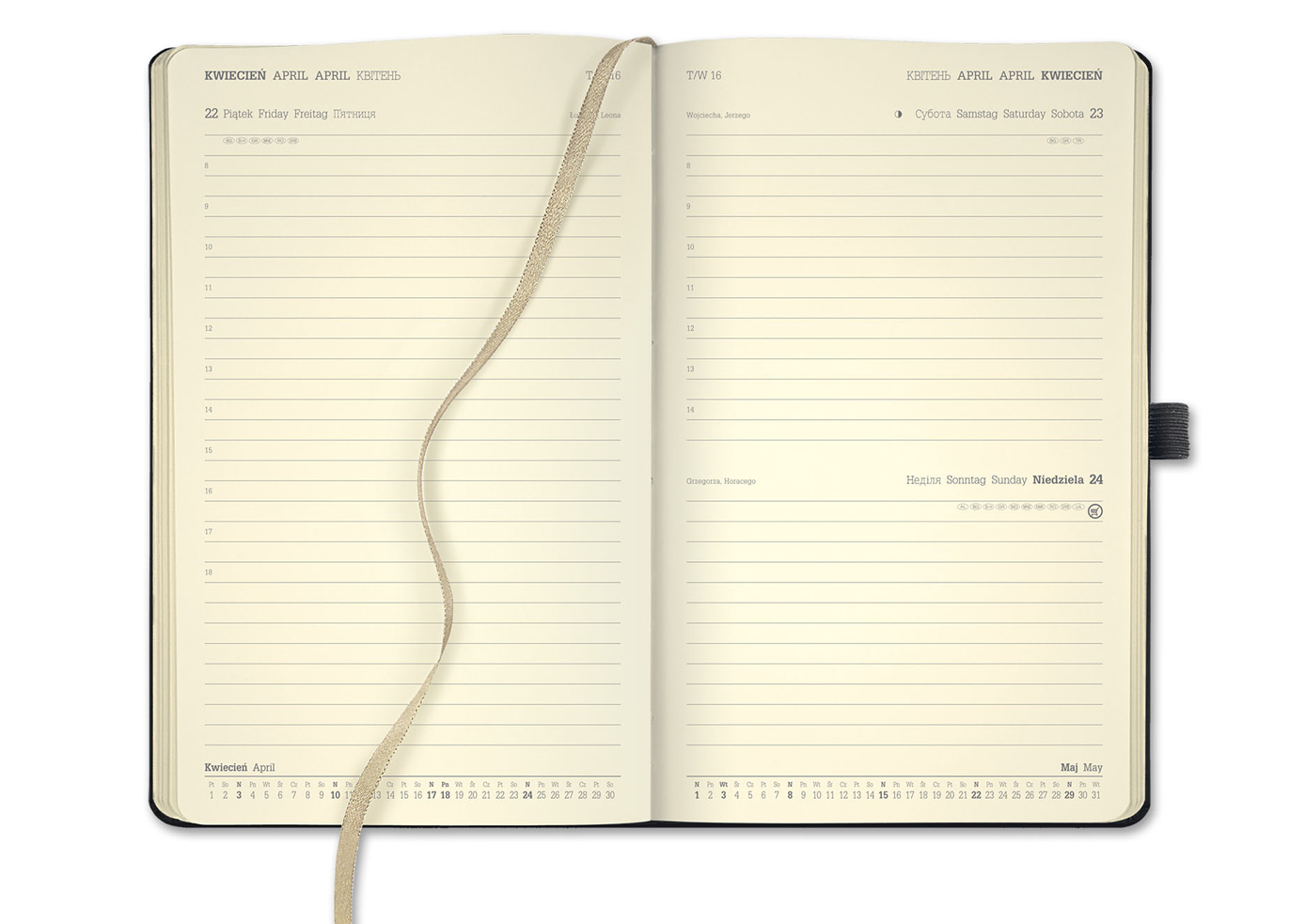 - Liczba stron: 352, kalendarium dzienne; 1 dzień = 1 strona, sobota i niedziela na jednej stronie
