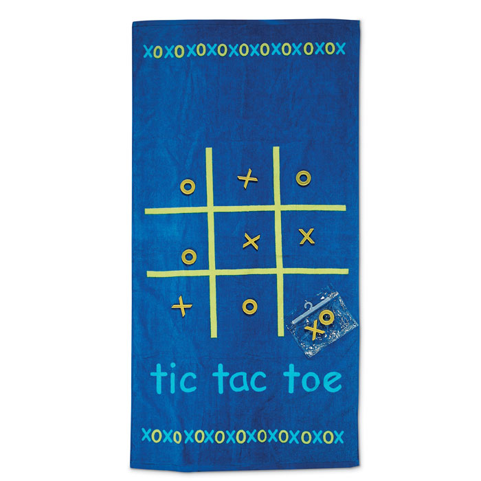 Ręcznik plażowy z grą w kółko i krzyżyk, zapakowaną w nylonowy worek. Materiał: 100% bawełna, gramatura: 300g/m2.