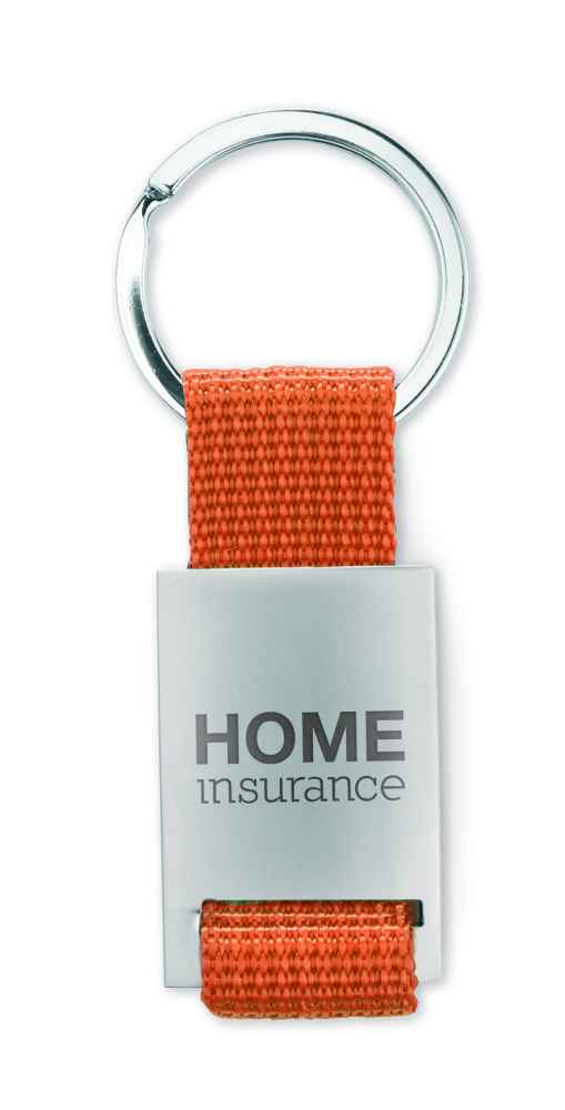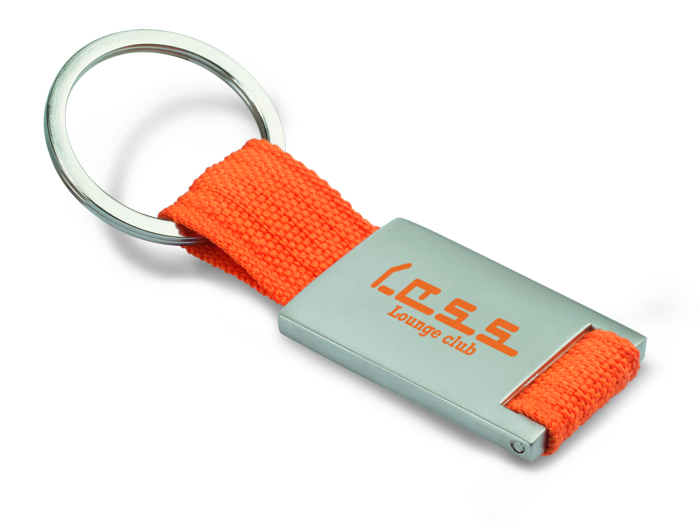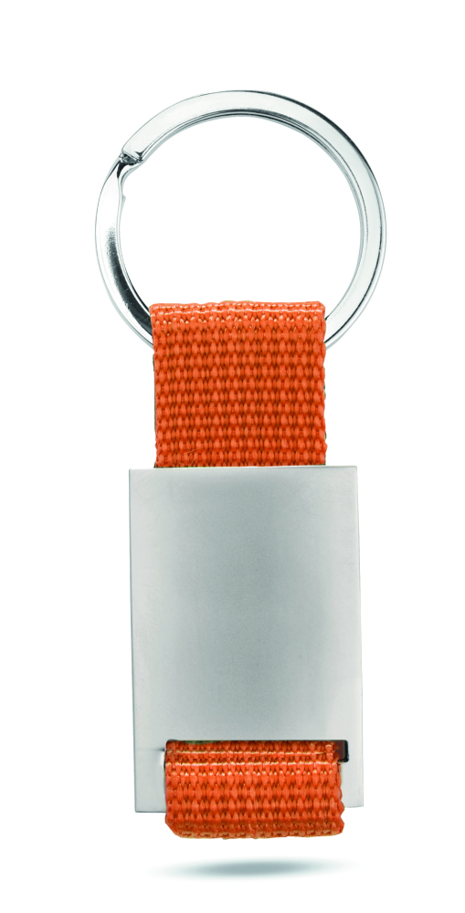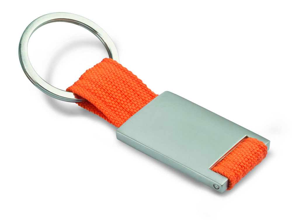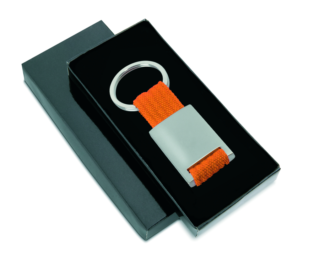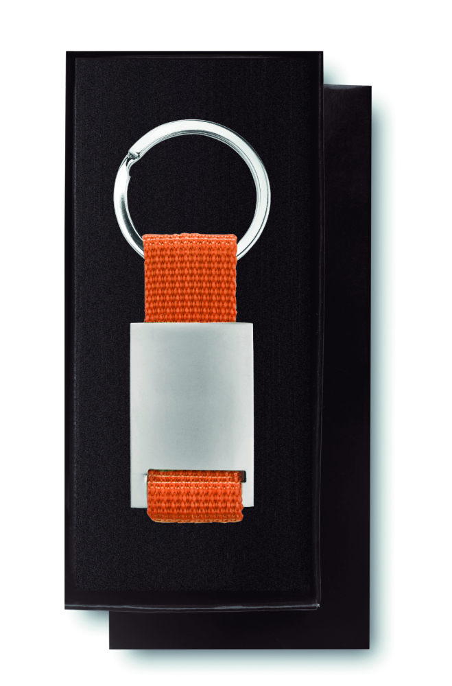 Prostokątny brelok ze stopu cynku i z kolorową plecioną taśmą z polyestru. Indywidualnie pakowany w czarne kartonowe pudełko.