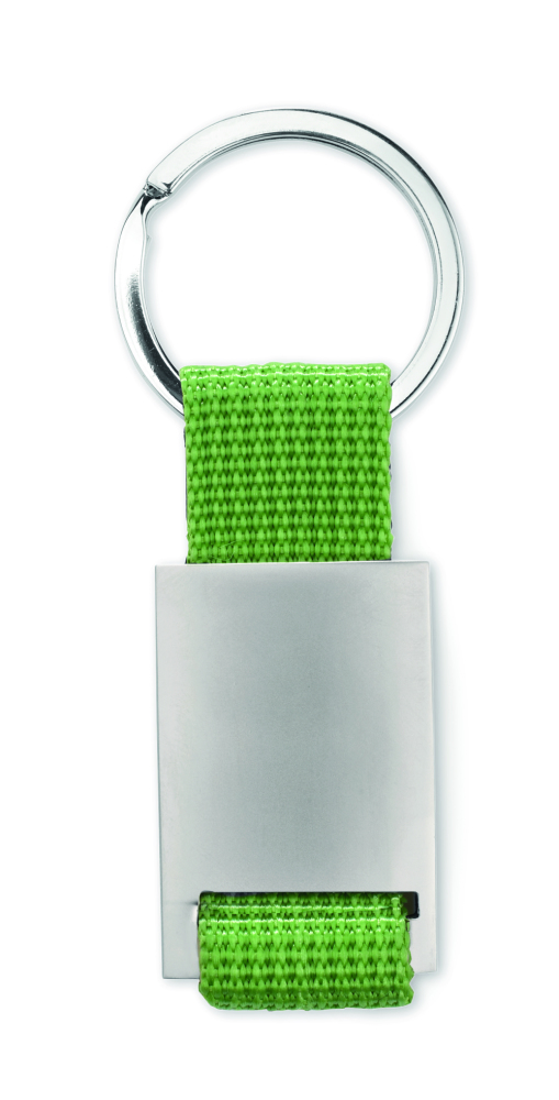 Prostokątny brelok ze stopu cynku i z kolorową plecioną taśmą z polyestru. Indywidualnie pakowany w czarne kartonowe pudełko.