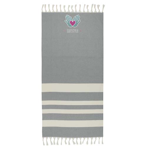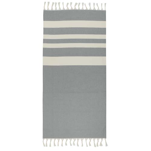 Ręcznik hammmam Anders zapewniający luksusowy komfort dzięki dużym wymiarom (147 x 75,5 cm) oraz dużą osłonę, niezależnie od tego, czy wylegujesz się przy basenie, czy spędzasz dzień na plaży.. Ręcznik ma eleganckie frędzle na obu końcach i jest wykonany z 30% bawełny, 35% bawełny z recyklingu z certyfikatem GRS i 35% poliestru z recyklingu z certyfikatem GRS, 180 g/m².