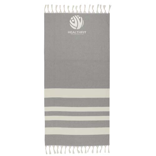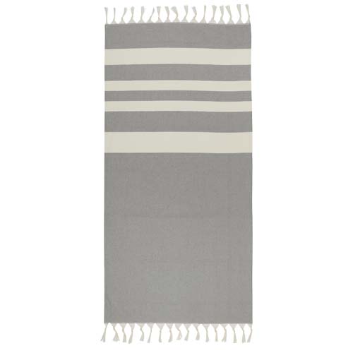 Ręcznik hammmam Anders zapewniający luksusowy komfort dzięki dużym wymiarom (147 x 75,5 cm) oraz dużą osłonę, niezależnie od tego, czy wylegujesz się przy basenie, czy spędzasz dzień na plaży.. Ręcznik ma eleganckie frędzle na obu końcach i jest wykonany z 30% bawełny, 35% bawełny z recyklingu z certyfikatem GRS i 35% poliestru z recyklingu z certyfikatem GRS, 180 g/m².