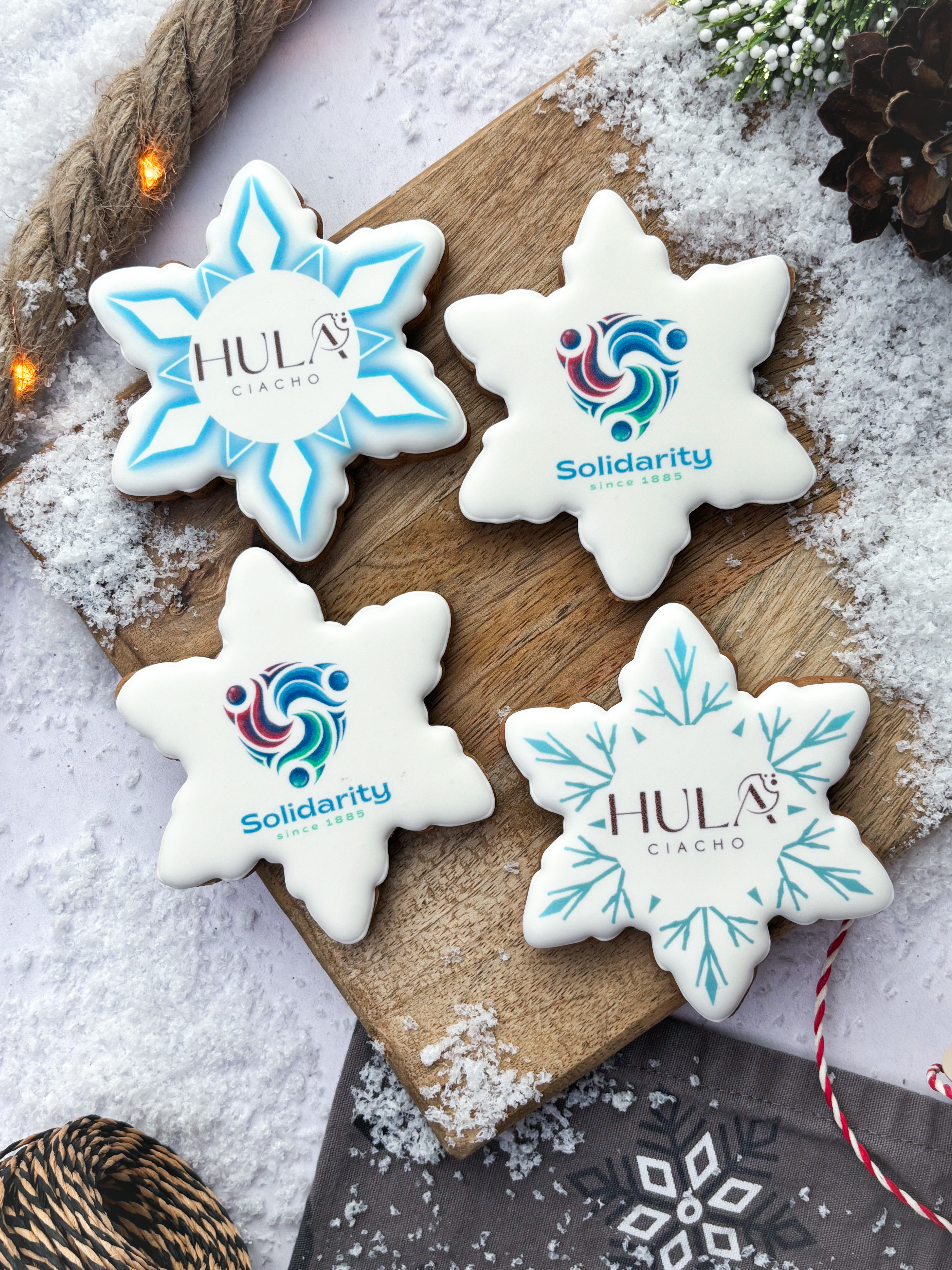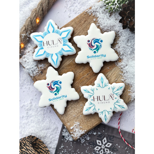 Oferujemy firmowe pierniki świąteczne z logo, pięknie zdobione pierniki w kształcie śnieżynek, które doskonale podkreślą charakter Twojej marki.