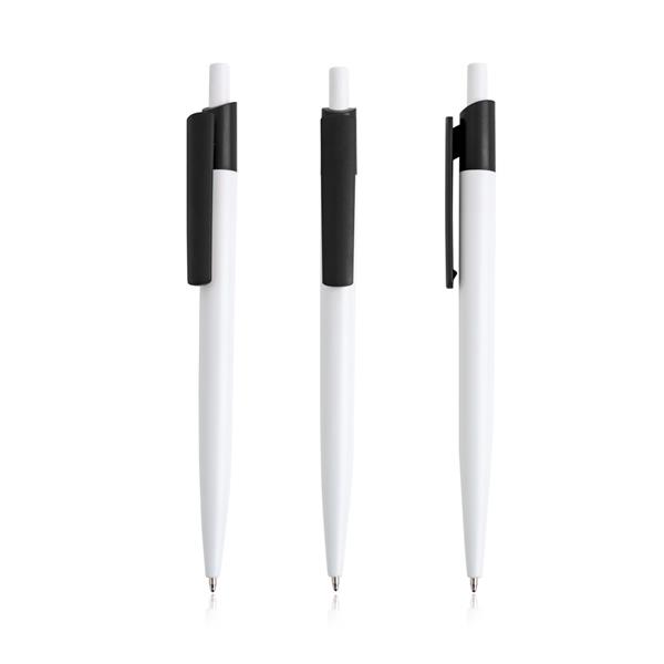 Długopis z recyklingowanego ABS. Recyklingowany długopis o nowoczesnym designie, z szerokim kolorowym klipsem i białym korpusem. Ten długopis z mechanizmem wciskanym pisze na niebiesko. Zobacz także wersję z kolorowym korpusem, numer 131542.