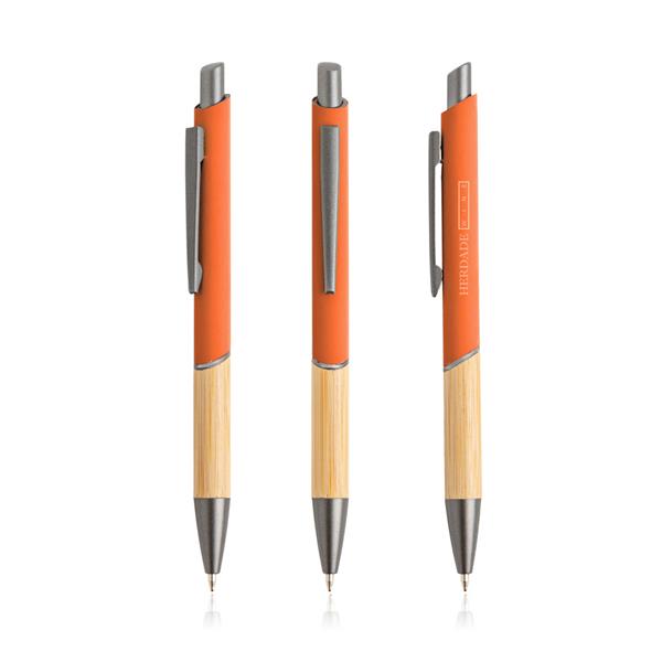 Długopis z recyklingowanego aluminium. Kupując ten długopis, pomagasz zmniejszyć ilość odpadów wynikających z braku ponownego użycia. Ten długopis piszący na niebiesko ma nowoczesny design, łączący recyklingowany metal z gumową powłoką i naturalnym bambusem.