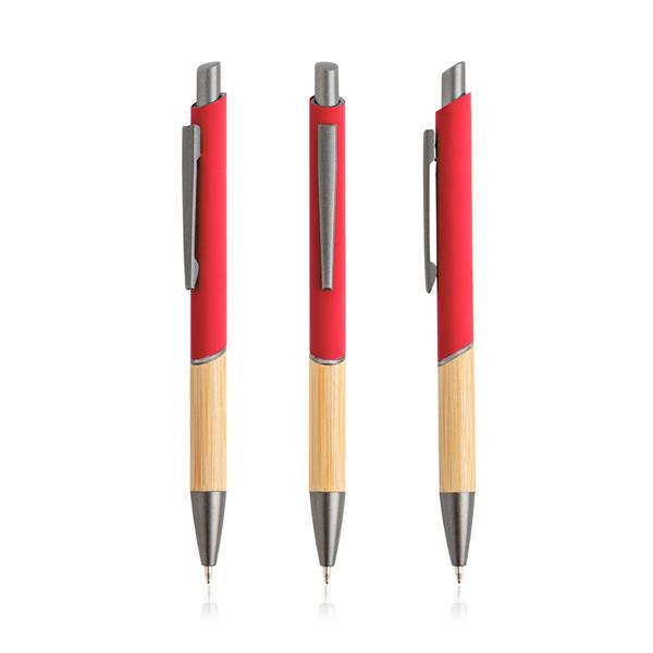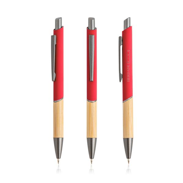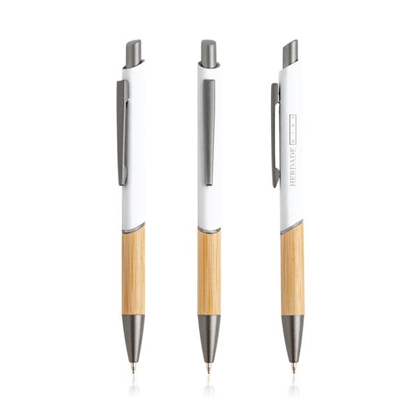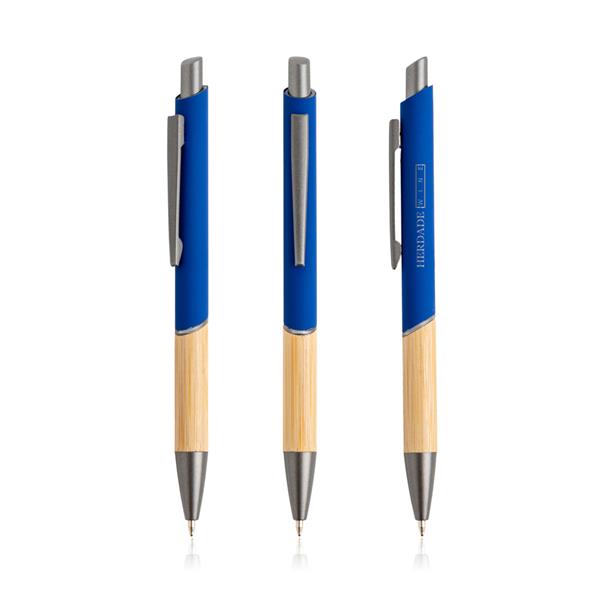 Długopis z recyklingowanego aluminium. Kupując ten długopis, pomagasz zmniejszyć ilość odpadów wynikających z braku ponownego użycia. Ten długopis piszący na niebiesko ma nowoczesny design, łączący recyklingowany metal z gumową powłoką i naturalnym bambusem.