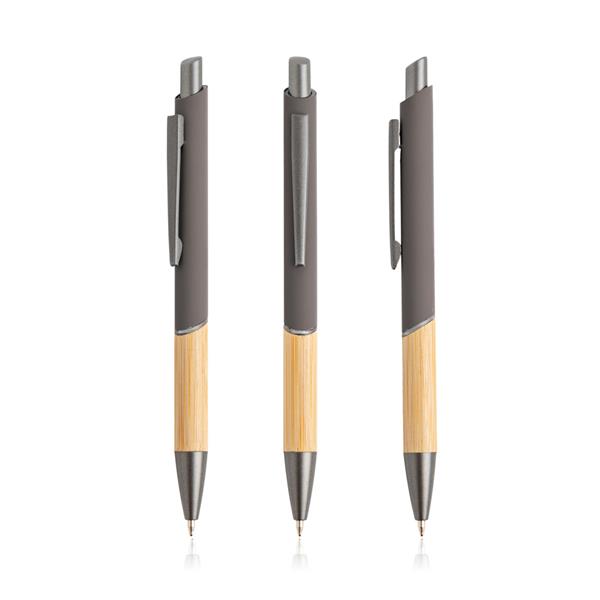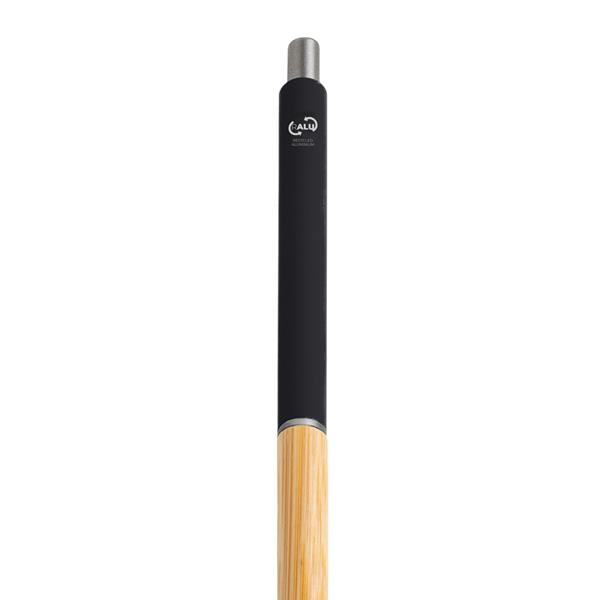 Długopis z recyklingowanego aluminium. Kupując ten długopis, pomagasz zmniejszyć ilość odpadów wynikających z braku ponownego użycia. Ten długopis piszący na niebiesko ma nowoczesny design, łączący recyklingowany metal z gumową powłoką i naturalnym bambusem.
