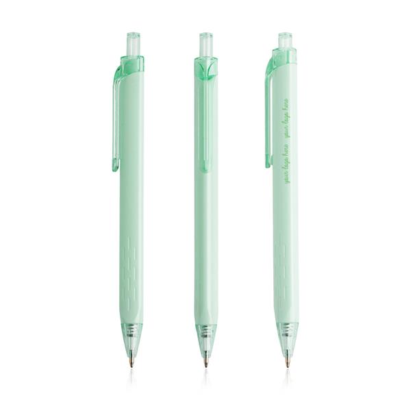 Plastikowy trójkątny długopis. Ten długopis z jednokolorowym korpusem i przezroczystymi detalami jest idealny do znakowania dzięki trójkątnym bokom korpusu. Ten długopis piszący na niebiesko posiada mechanizm wciskany.