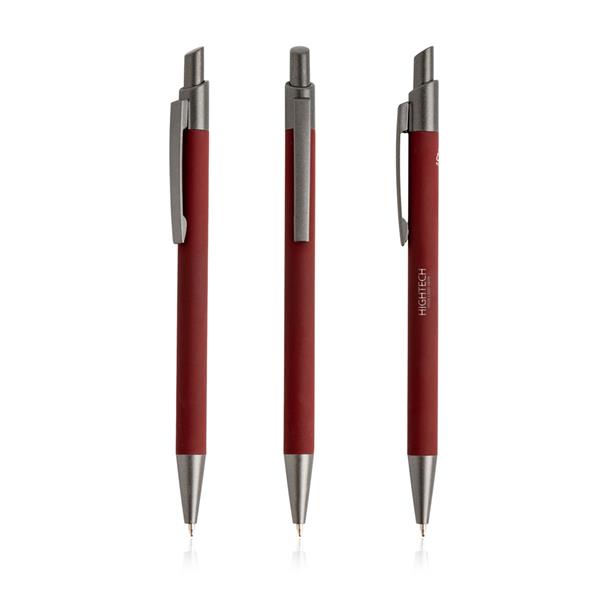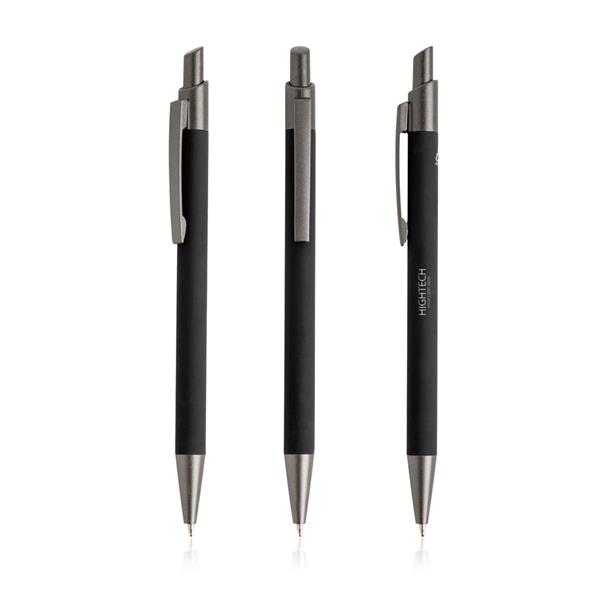 Długopis z recyklingowanego aluminium z powłoką soft touch. Ekologiczny prezent o nowoczesnym designie, z eleganckim akcentem . Ten długopis z mechanizmem wciskanym pisze na czarno.