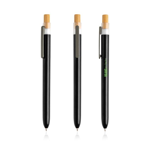 Długopis z bambusowym detalem. Długopis wykonany z przetworzonego plastiku oceanicznego, z jednolitym kolorem korpusu i bambusowym przyciskiem, pisze na czarno. Zobacz także wersję z przezroczystym korpusem 131598.
