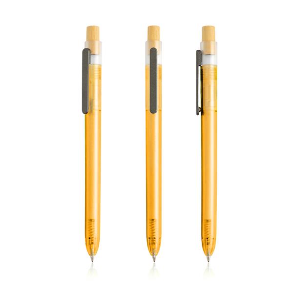 Długopis z bambusowym detalem. Długopis wykonany z przetworzonego plastiku z oceanów, z przezroczystym korpusem i bambusowym przyciskiem, pisze na niebiesko. Zobacz także wersję z przezroczystym korpusem 131597