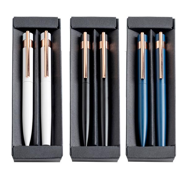 Zestaw piśmienniczy w czarnym kartoniku prezentowym wykończony elementami w kolorze rose gold, idealnie nadaje się do grawerowania. Kolor lasera wychodzi w kolorze różowozłotych detali.