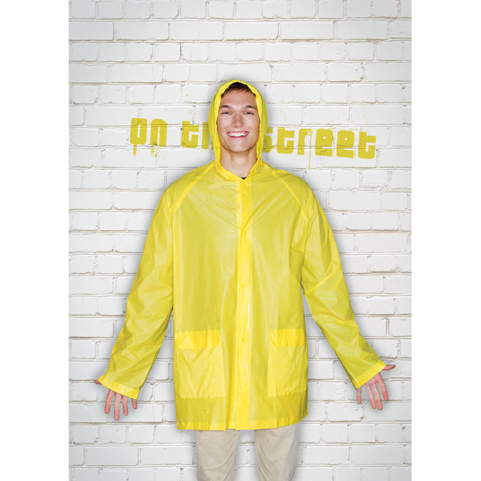 Płaszcz przeciwdeszczowy z kapturem. PVC. Zapinany na zatrzaski.
