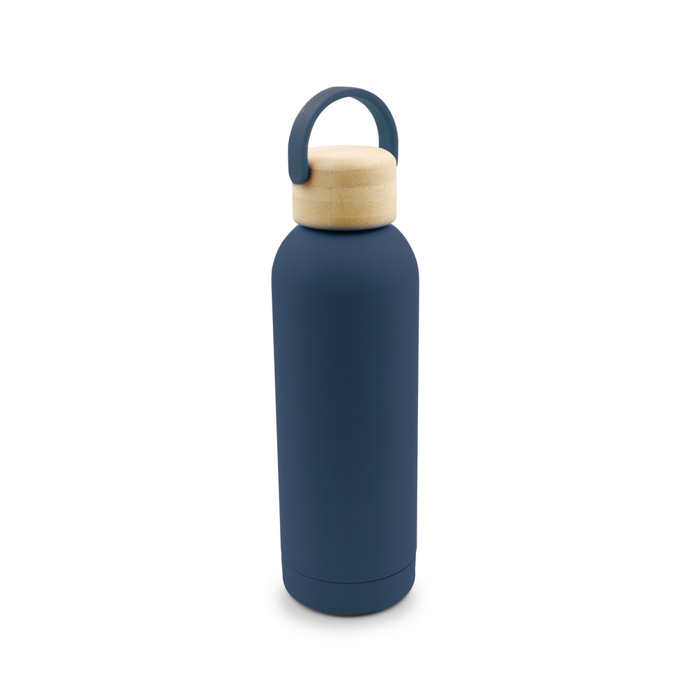 Butelka termiczna 500 ml, posiada podwójne ścianki ze stali nierdzewnej z próżnią między ściankami, co spowalnia oddawanie temperatury na zewnątrz, zachowując funkcje termosu, gumowe wykończenie, bambusowa zakrętka ze składanym uchwytem wykonanym z silikonu ułatwiającym noszenie, produkt wykonany ze stali nierdzewnej, plastiku i bambusa, klasa termiczna: A +leakproof