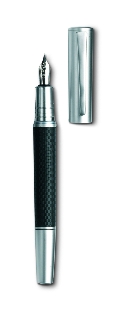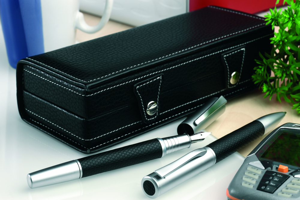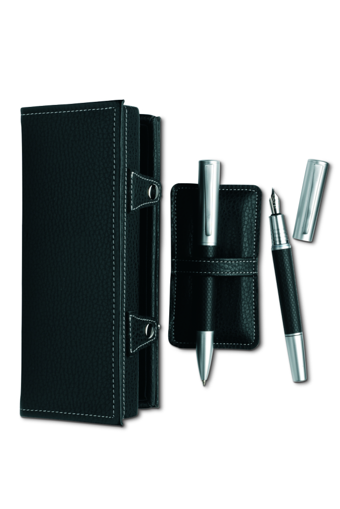 Wysokiej klasy zestaw piśmienny w pudełku posiada długopis z czarnym wkładem oraz pióro.