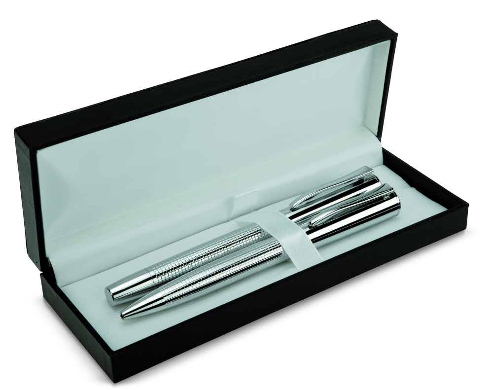 Metalowy długopis i cienkopis w ozdobnym pudełku. Czarny wkład.
