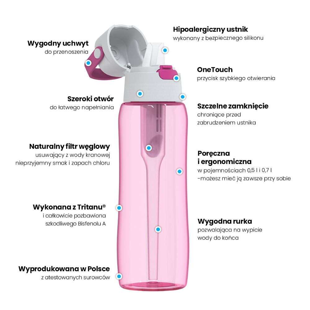 Wyprodukowana w Polsce, zaprojektowana z myślą o osobach aktywnych, dbających o zdrowie i regularne nawodnienie. Ergonomiczna, poręczna, zawsze gotowa towarzyszyć Ci w codziennych wyzwaniach – bez potrzeby kupowania wody w jednorazowych opakowaniach.