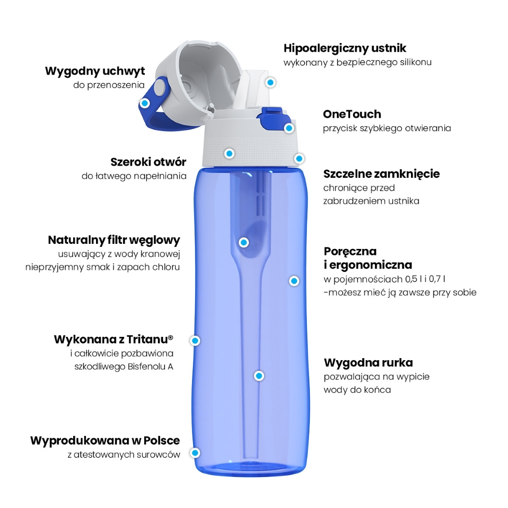 Wyprodukowana w Polsce, zaprojektowana z myślą o osobach aktywnych, dbających o zdrowie i regularne nawodnienie. Ergonomiczna, poręczna, zawsze gotowa towarzyszyć Ci w codziennych wyzwaniach – bez potrzeby kupowania wody w jednorazowych opakowaniach.