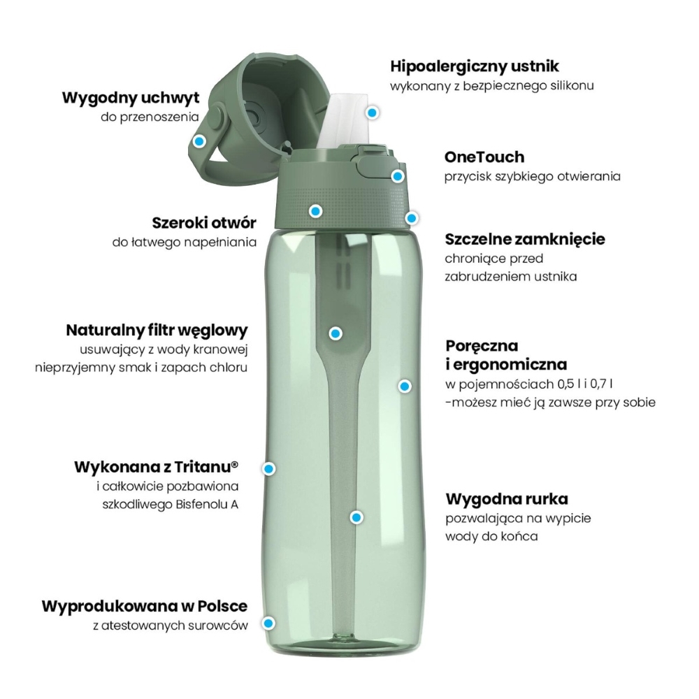 Wyprodukowana w Polsce, zaprojektowana z myślą o osobach aktywnych, dbających o zdrowie i regularne nawodnienie. Ergonomiczna, poręczna, zawsze gotowa towarzyszyć Ci w codziennych wyzwaniach – bez potrzeby kupowania wody w jednorazowych opakowaniach.