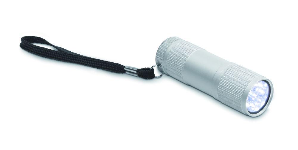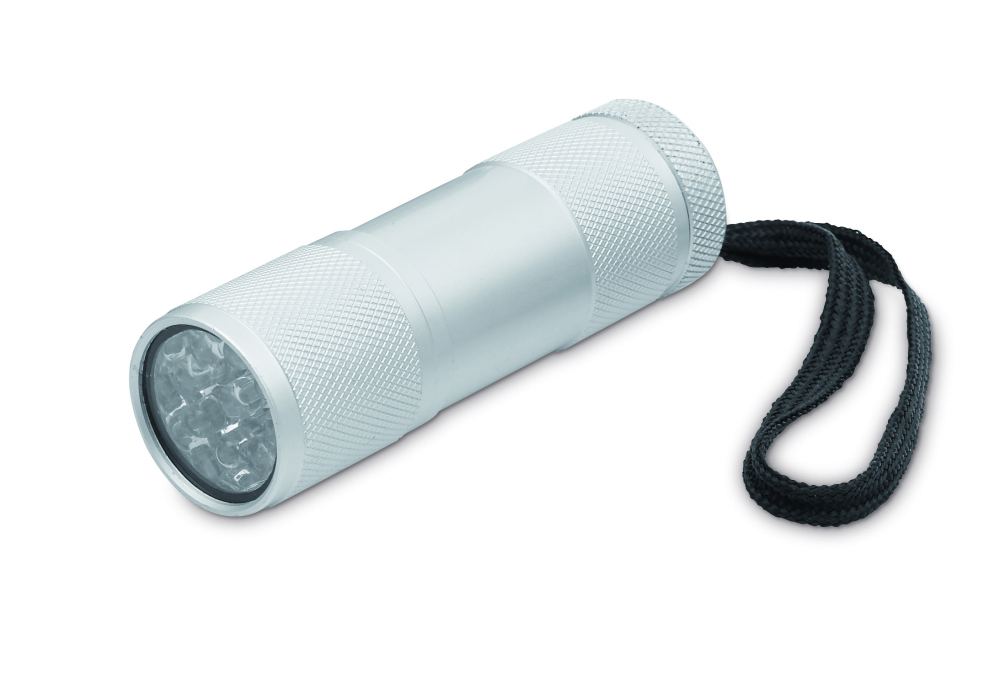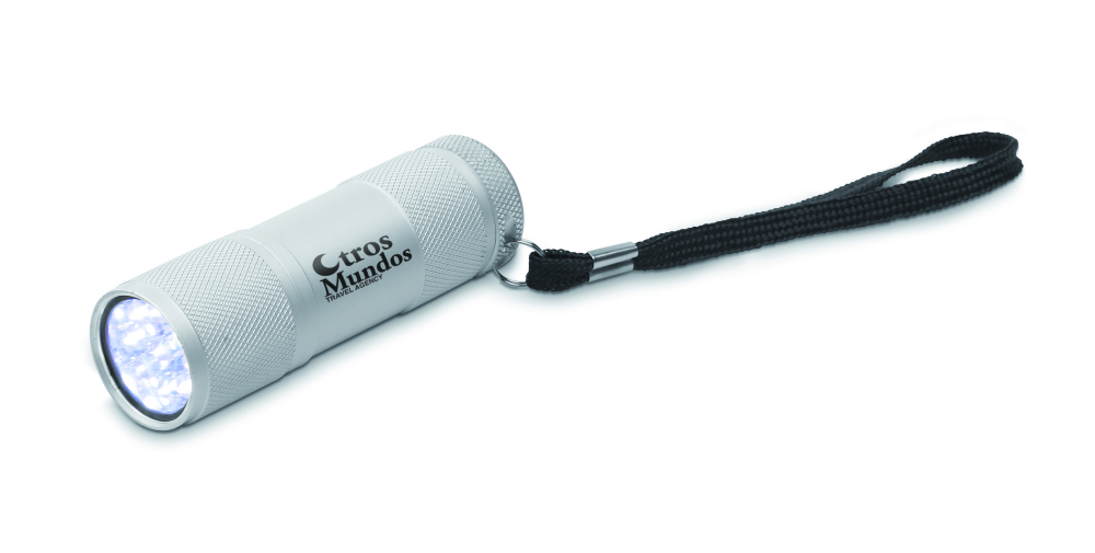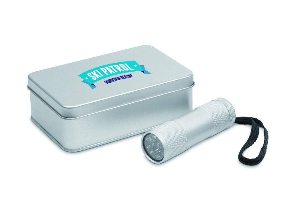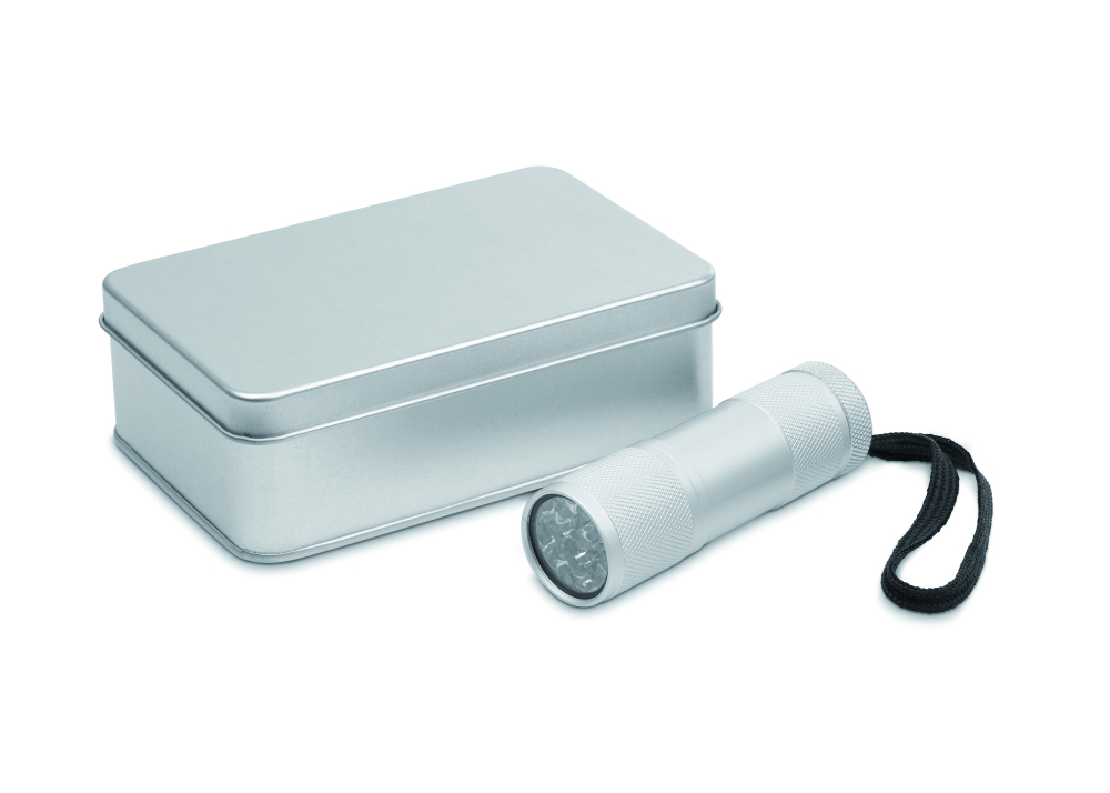 Metalowa latarka z 9 diodami LED. 3 baterie AAA oraz smyczka na nadgarstek w komplecie. Nowy kolor: czarny. Metalowe pudełko.