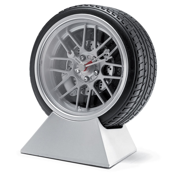 Zegar na biurko w kształcie koła samochodu. Podstawa zaprojektowana pod znakowanie. 1 bateria AA nie dołączona.