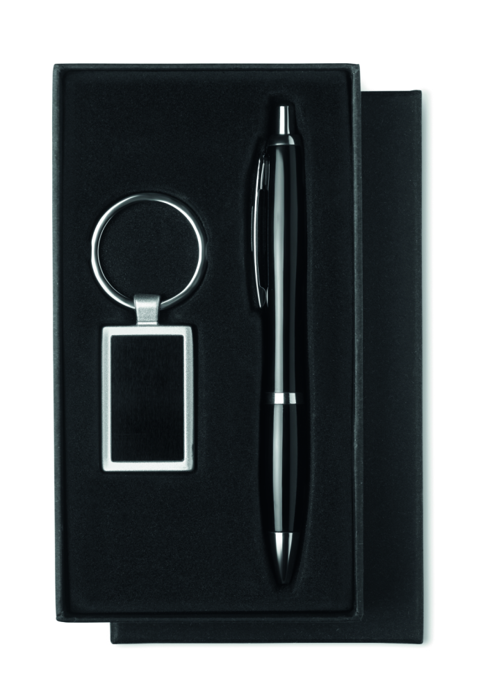 Atrakcyjny prezent. Plastikowy przekręcany długopis z metalicznym wykończeniem i aluminiowy brelok z dobraną kolorystycznie płytką na logo. Czarne kartonowe pudełko. Niebieski wkład.