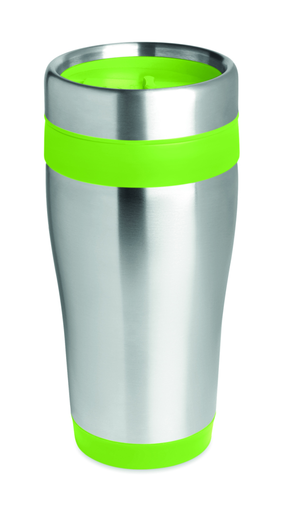 Kubek ze stali nierdzewnej, podwójne ścianki, pastikowe wnętrze, przykrywka. Pojemność: 455 ml.