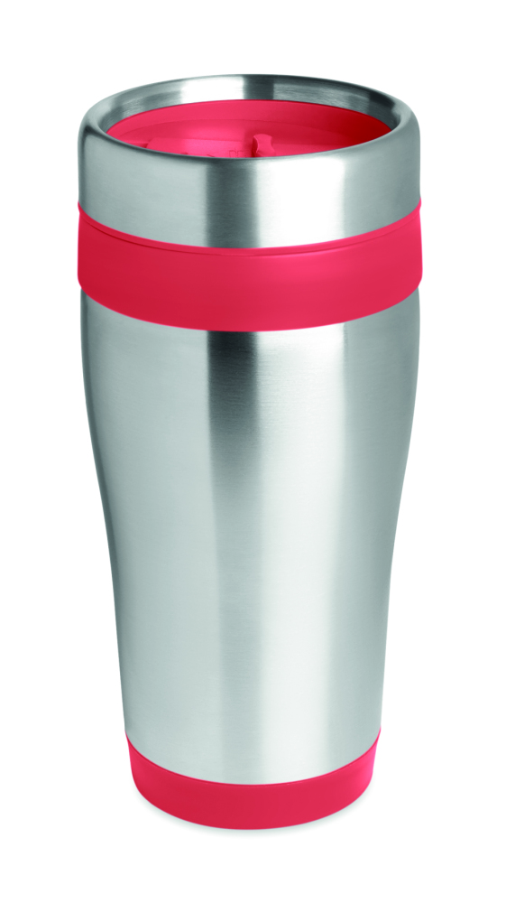 Kubek ze stali nierdzewnej, podwójne ścianki, pastikowe wnętrze, przykrywka. Pojemność: 455 ml.