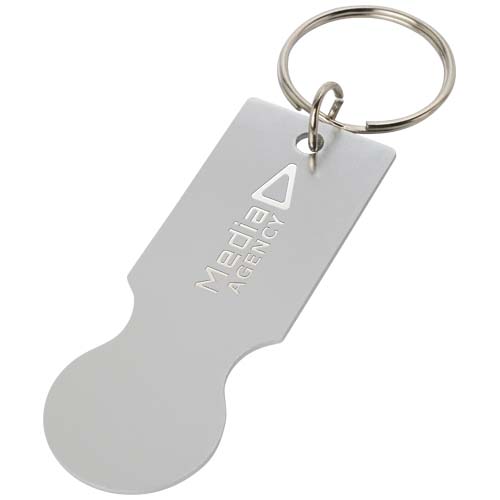 Metalowy brelok Rhea z żetonem do wózka został zaprojektowany tak, aby pasował do większości wózków sklepowych, umożliwiając ich otwieranie bez użycia monet lub żetonów.