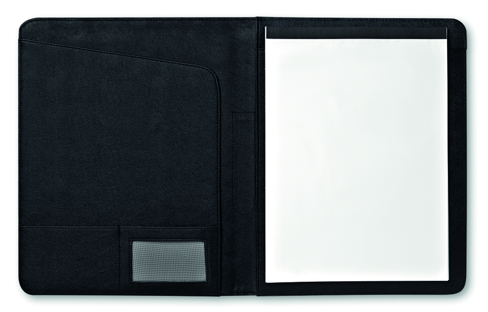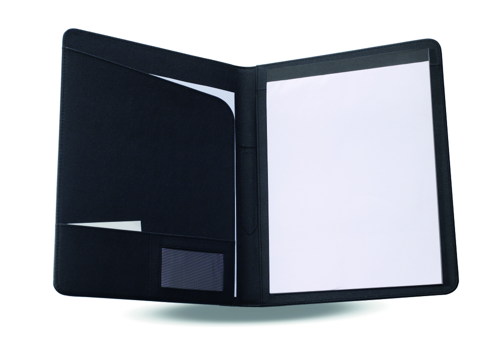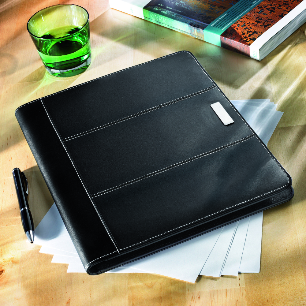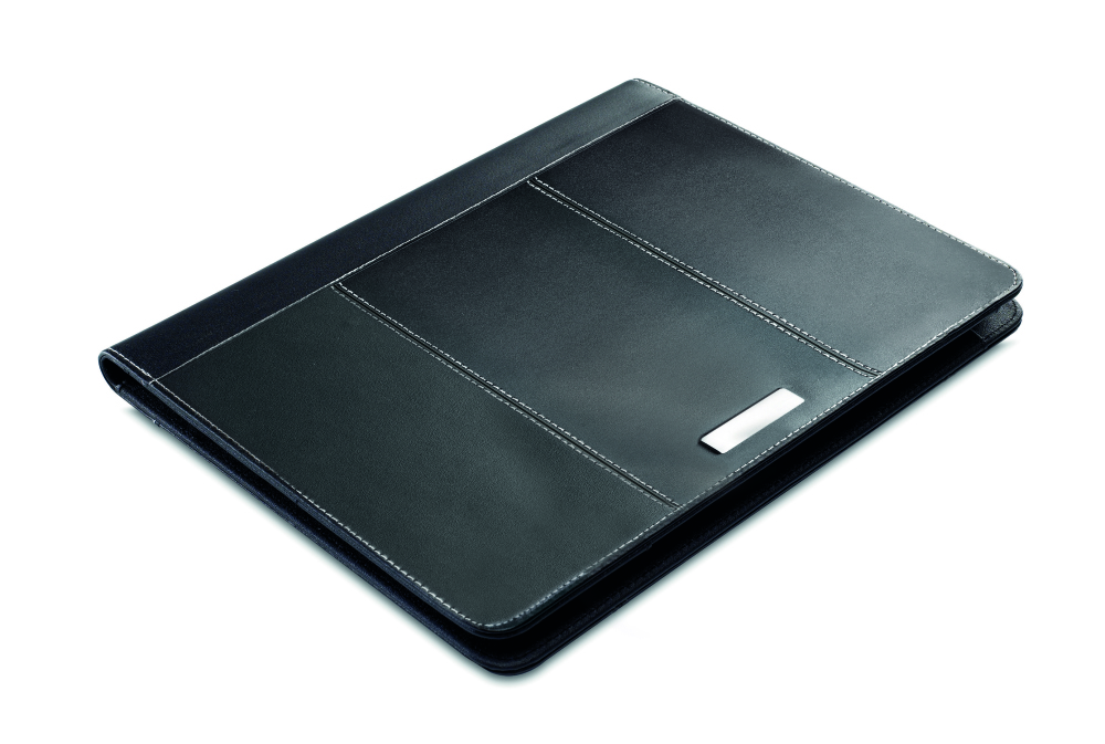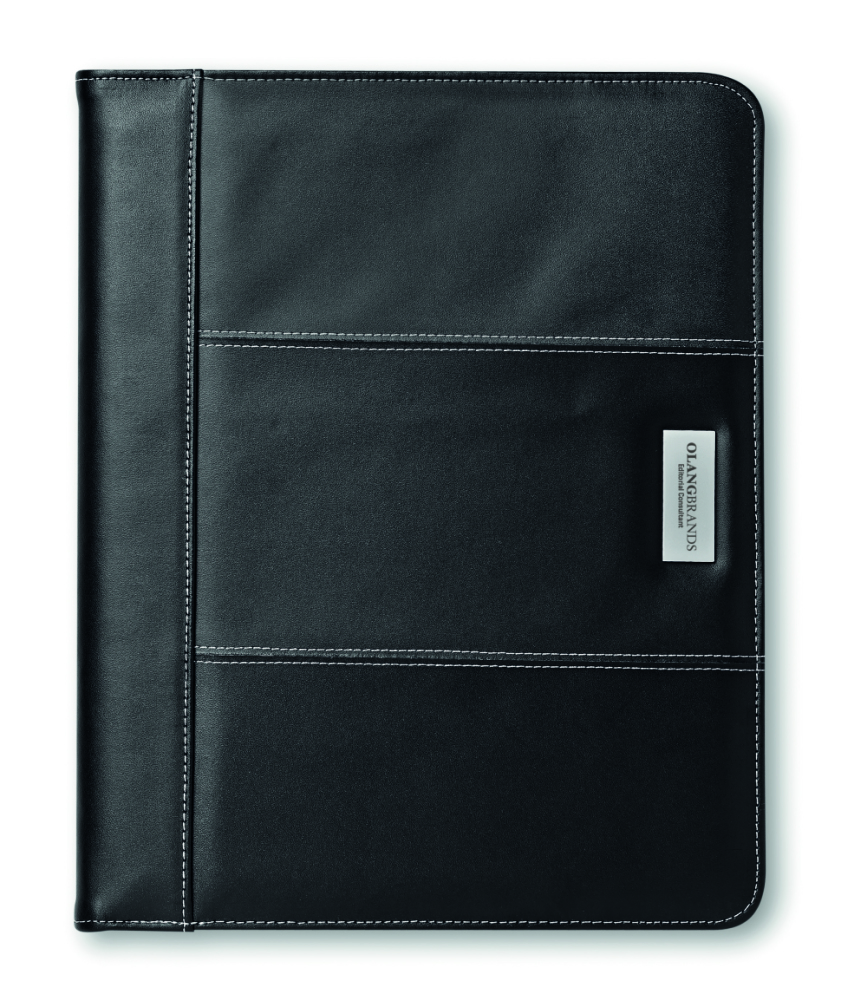Portfolio A4 z kontrastowym przeszyciem i ozdobną metalową płytką na logo. Klejona skóra. Wewnątrz przegroda na wizytówki, miejsce na długopis i 50 białych kartek.