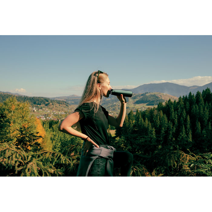 Izolowana próżniowo butelka z podwójnymi ściankami z recyklingowanej stali nierdzewnej (90% z recyklingowanej stali nierdzewnej i 10% ze stali nierdzewnej) ze zintegrowanym uchwytem sznurkowym w zakrętce z PP. Nie przecieka. Pojemność: 500 ml.