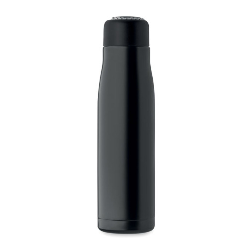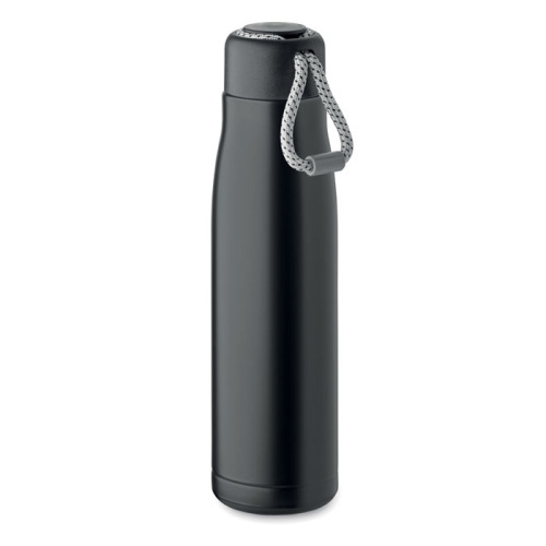 Izolowana próżniowo butelka z podwójnymi ściankami z recyklingowanej stali nierdzewnej (90% z recyklingowanej stali nierdzewnej i 10% ze stali nierdzewnej) ze zintegrowanym uchwytem sznurkowym w zakrętce z PP. Nie przecieka. Pojemność: 500 ml.