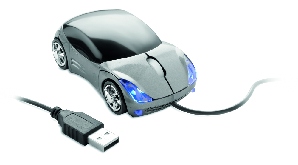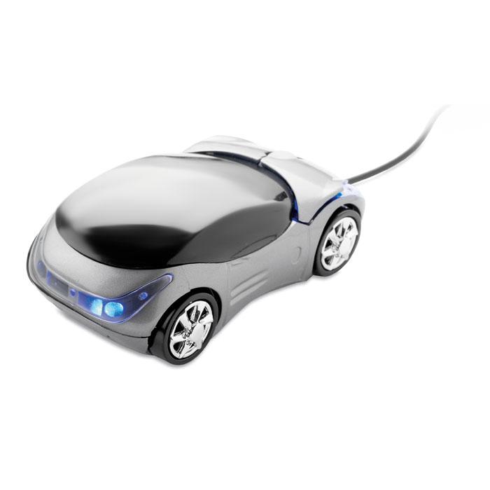 Mysz optyczna w kształcie samochodu. W trakcie używania świeci na niebiesko. Obudowa z ABS z metalicznym matowym wykończeniem. 800dpi.