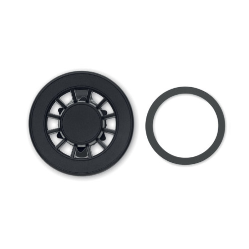 Ruchomy (360 stopni) magnetyczny uchwyt na telefon z tworzywa ABS. Zawiera dodatkowy magnetyczny metalowy pierścień do ładowania niemagnetycznych telefonów z możliwością ładowania bezprzewodowego.