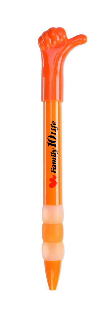 Plastikowy długopis z ABS, z końcówką w kształcie dłoni. Niebieski wkład.