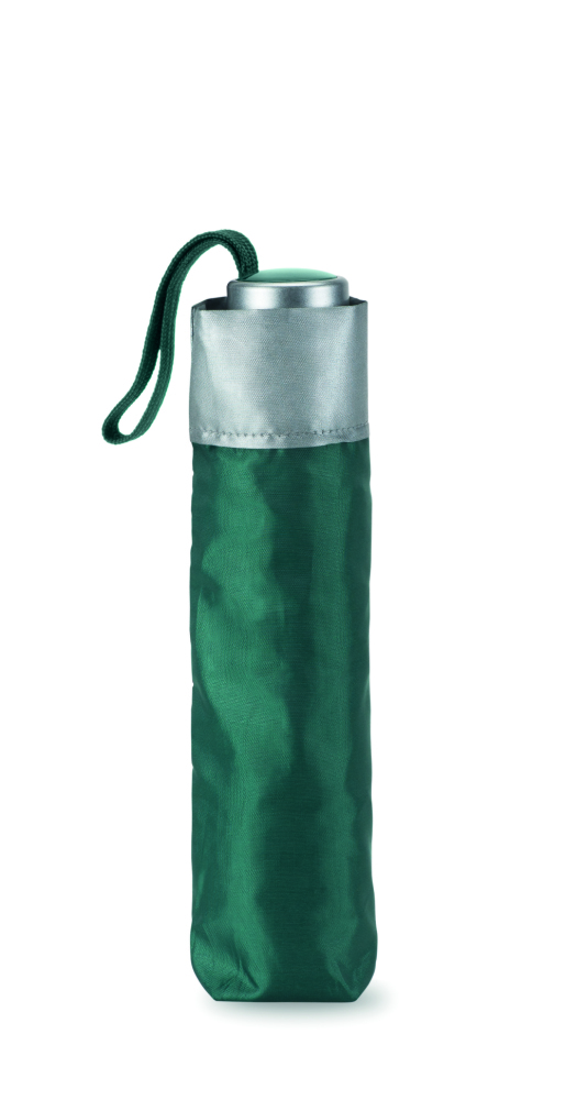 Parasolka składana ręcznie na 3, ze srebrną podszewką wewnątrz. Rozmiar: 21 cali, trzon i koncówki ocynkowane, czarne lakierowane żebra. Srebrna, plastikowa rączka z kolorystycznie dobranym paskiem na rękę. Dobrany kolorystycznie pokrowiec ze srebrną wstawką. Materiał: poliester 190T.