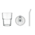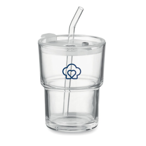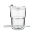Szklany kubek z pokrywką i wyjmowaną szklaną słomką. Szczelna pokrywka z otworem na słomkę i otworem do picia. Pojemność 400 ml.