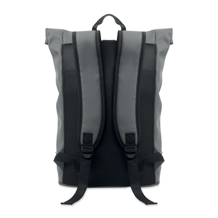 15-calowy plecak na laptopa z miękkiego PU z wyściełanym tyłem i wzmocnieniem podstawy z odblaskowym paskiem. Wodoodporna kieszeń przednia zapinana na zamek. Podszewka z poliestru 210D RPET.