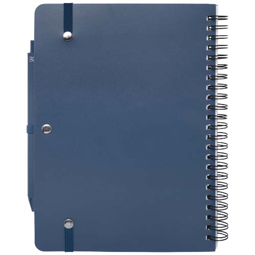 Notatnik w twardej oprawie Thalaasa w formacie A5 jest wykonany z przetworzonego plastiku pochodzącego z oceanów i zawiera 80 kartek w linie o gramaturze 70 g/m² w kolorze kremowym. Notatnik ma zaokrąglone rogi, elastyczne zamknięcie i szlufkę na długopis. Długopis z czarnym tuszem również został wykonany z plastiku pochodzącego z recyklingu i wyrzuconego do oceanu. Żywotność: 1000 metrów. Rozmiar stalówki: 1,0 mm.