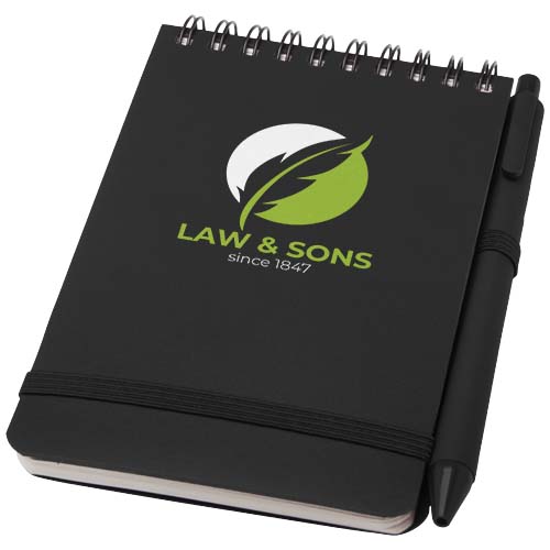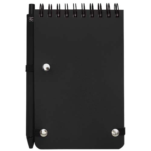 Notatnik w twardej oprawie Thalaasa w formacie A6 jest wykonany z przetworzonego plastiku pochodzącego z oceanów i zawiera 80 kartek w linie o gramaturze 70 g/m² w kolorze kremowym. Notatnik ma zaokrąglone rogi, elastyczne zamknięcie i szlufkę na długopis. Długopis z czarnym tuszem również został wykonany z plastiku pochodzącego z recyklingu i wyrzuconego do oceanu. Żywotność: 1000 metrów. Rozmiar stalówki: 1,0 mm.