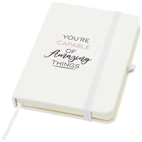 Notatnik Spectrum Plus w formacie A6 z twardą okładką i zaokrąglonymi rogami to nie tylko niezbędny element wyposażenia biura, ale także świetna okazja do promocji marki. Tekturowy notatnik ma miękką okładkę i 80 liniowanych, kremowych kartek o gramaturze 70 g/m². Jest idealny do zapisywania szybkich pomysłów lub dłuższych notatek. Notatnik jest wyposażony w szlufkę na długopis, elastyczne zamknięcie, wstążkową zakładkę i harmonijkową kieszonkę.